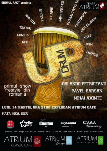DRUM UP este un nou spectacol interactiv care combină percuţie, pantomimă, step, teatru, muzică, improvizaţie, parodie; este un show exploziv, plin de umor şi limbaje artistice. Se zice că DRUM UP A SCHIMBAT PERCEPŢIA OAMENILOR ASUPRA ZILEI DE MUNCĂ. Noi zicem să veniţi singuri să vă convingeţi! DRUM UP face invizibilă bariera dintre public şi actori. Un show care începe cu 3 oameni şi se termină cu o scenă plină de oameni.