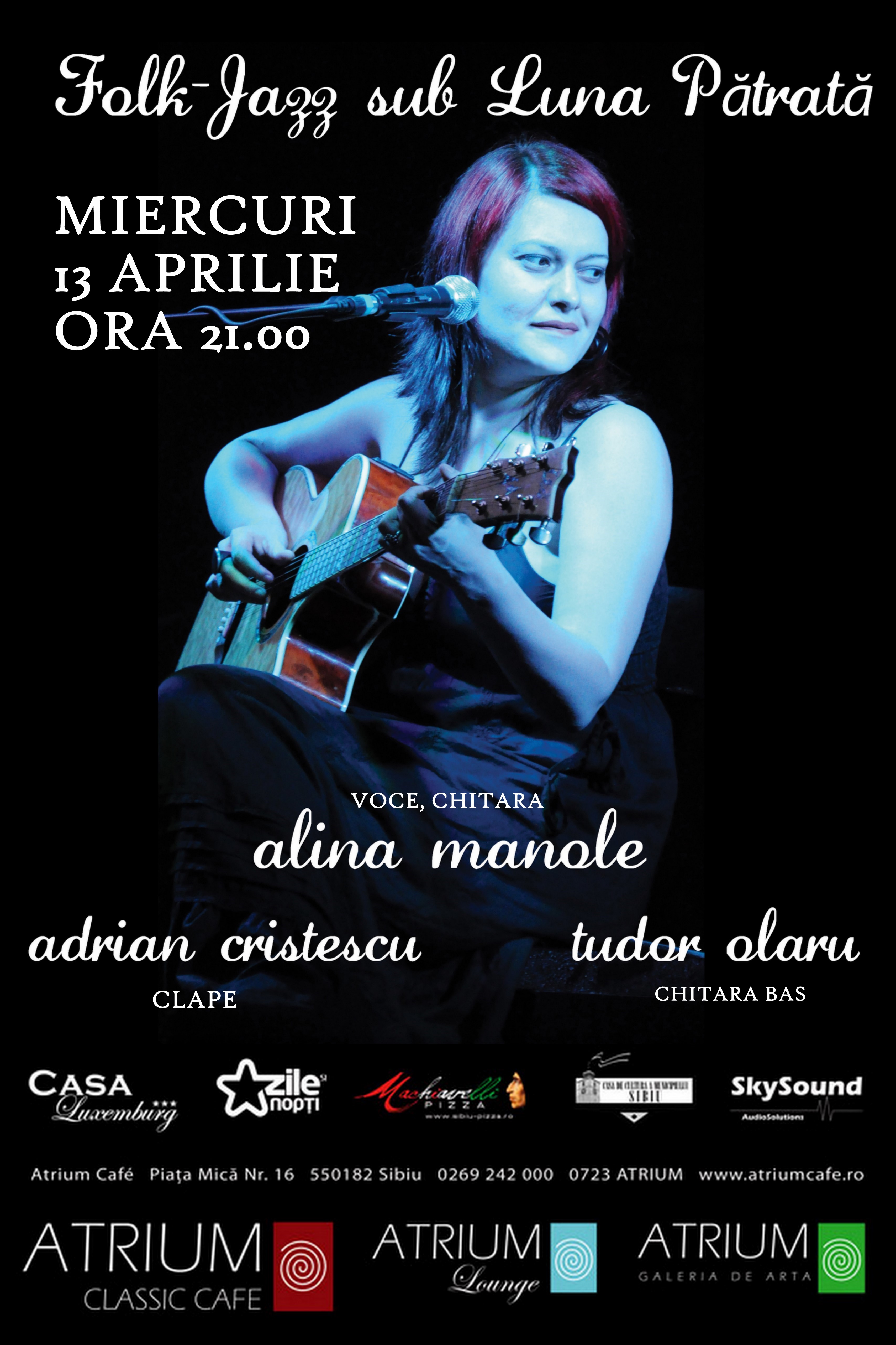 Atrium Classic Cafe vă invită miercuri, 13 aprilie, ora 21.00, la un concert de folk-jazz sub LUNA PĂTRATĂ: Alina Manole (voce, chitară), Adrian Cristescu (clape) şi Tudor Olaru (chitară bas).