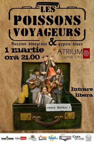 Vă invităm în Atrium Classic Cafe la un concert ieşit din tipare alături de LES POISSONS VOYAGEURS. Trupa canadiană/franceză ne propune un concert denumit de ei „recital de călătorie”. Asta pentru că muzica lor a crescut armonios chiar dacă a adunat foarte multe influenţe de peste tot pe unde au ajuns.