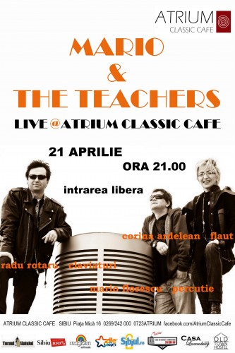 Pe data de 21 aprilie, de la ora 21:00, trupa de ethno-fusion Mario & The Teachers va concerta în Atrium Classic Cafe. Intrarea este liberă.