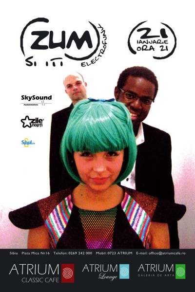 ZUM revine în Atrium Clasic Café. Pentru cei care nu au auzit încă de ei, ZUM este o îmbinare specială de world music cu electro funk, o combinaţie de instrumente cântate live cu ritmuri şi efecte create cu ajutorul computerului. Colaborările de-a lungul timpului cu diferiţi instrumentişti şi solişti vocali au îmbogăţit şi diversificat mesajul muzical, fără însă a părăsi stilistic zona electro. Improvizaţiile „jazzy” se împletesc cu sweep-uri electronice, creând un sound fresh şi funky. ZUM a cântat de patru ori în cadrul Festivalului de la Sziget (Budapesta), pe scena de muzică ambientală. De asemenea, a avut concerte în cluburi din Danemarca, Bruxelles şi Budapesta, iar prin intermediul Institutului Cultural Român a participat la diferite festivaluri europene de promovare a culturii române peste hotare.
