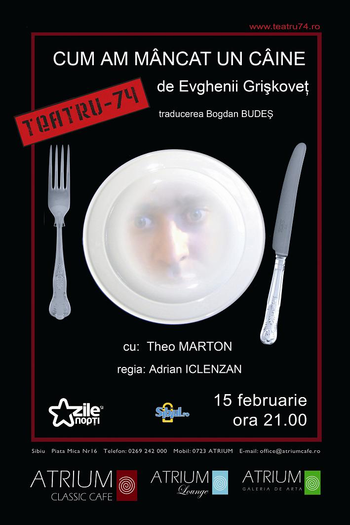ATRIUM CLASSIC CAFE prezintă Luni, 15 februarie 2010, ora 21.00, în cadrul serilor de teatru, spectacolul „Cum am mâncat un câine”, regia Adi ICLENZAN, cu Theo MARTON de la Teatru74 (www.teatru74.ro).