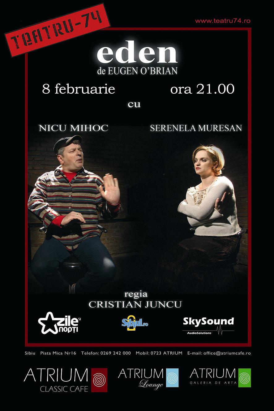 ATRIUM CLASSIC CAFE prezintă Luni, 8 februarie 2010, ora 21.00, tragi-comedia „EDEN” scrisă de Eugene O’Brien şi jucată de Nicu Mihoc şi Serenela Mureşan, sub regia lui Cristi Juncu, „EDEN” este genul de piesă la care râzi cu poftă…până la un punct, când lacrimile s-ar putea să-şi facă o binemeritată […]