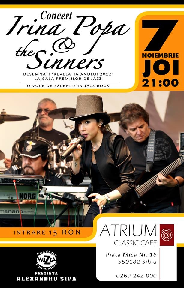 Vă invităm joi 7 noiembrie 2013 ora 21:00 la un Super Jazz Concert cu IRINA POPA & THE SINNERS, concert care va avea loc la ATRIUM Cafe Bistro & Art cu prilejul lansării CD-ului – BEST ROMANIAN JAZZ-TRIBUTE TO JANCY KOROSSY. IRINA POPA & THE SINNERS Laureată a Galei […]