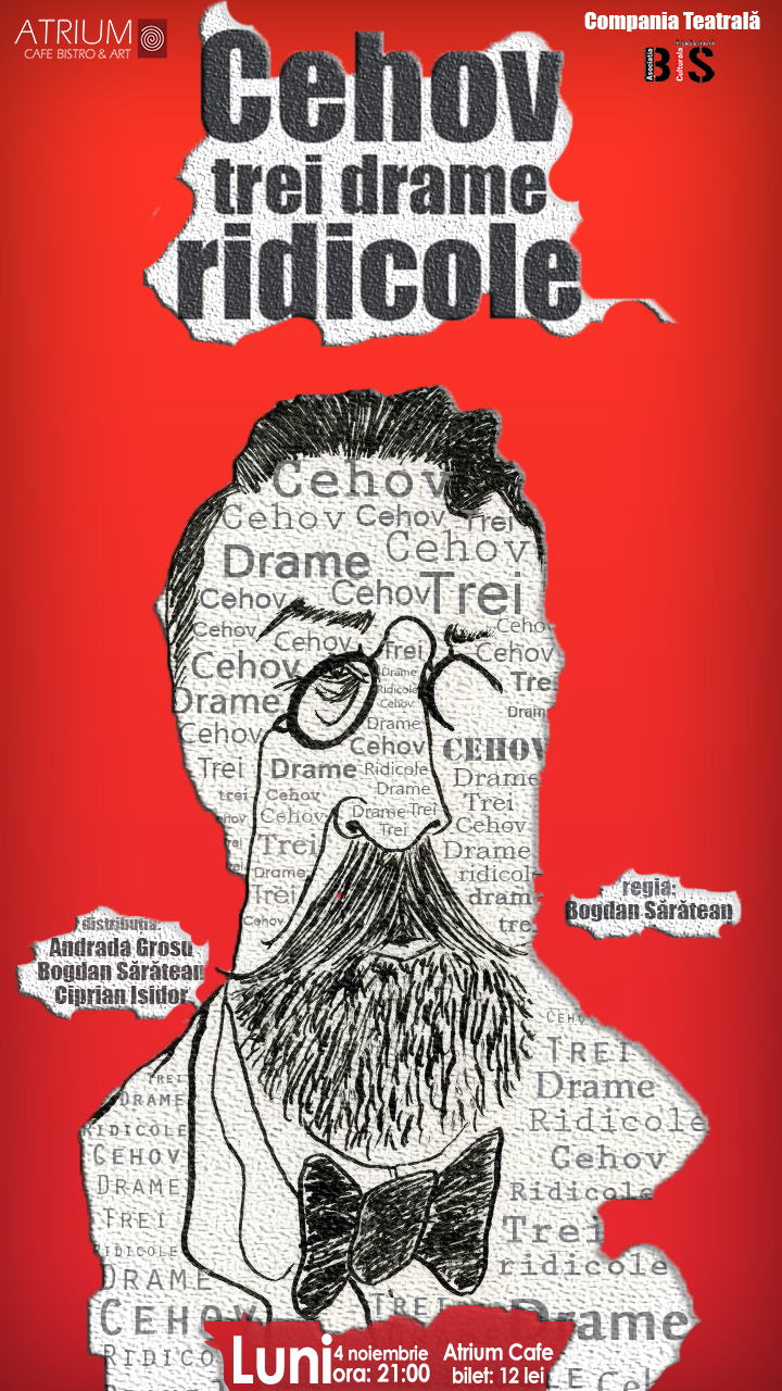 La cererea publicului, la Atrium Café se joacă din nou Cehov ! Comedie de cea mai bună calitate. Pentru că acum două săptămâni capacitatea localului nostru nu a făcut faţă cererii spectatorilor. Pentru că spectacolul “CEHOV – TREI DRAME RIDICOLE” a fost selecţionat de către un juriu profesionist venit din […]