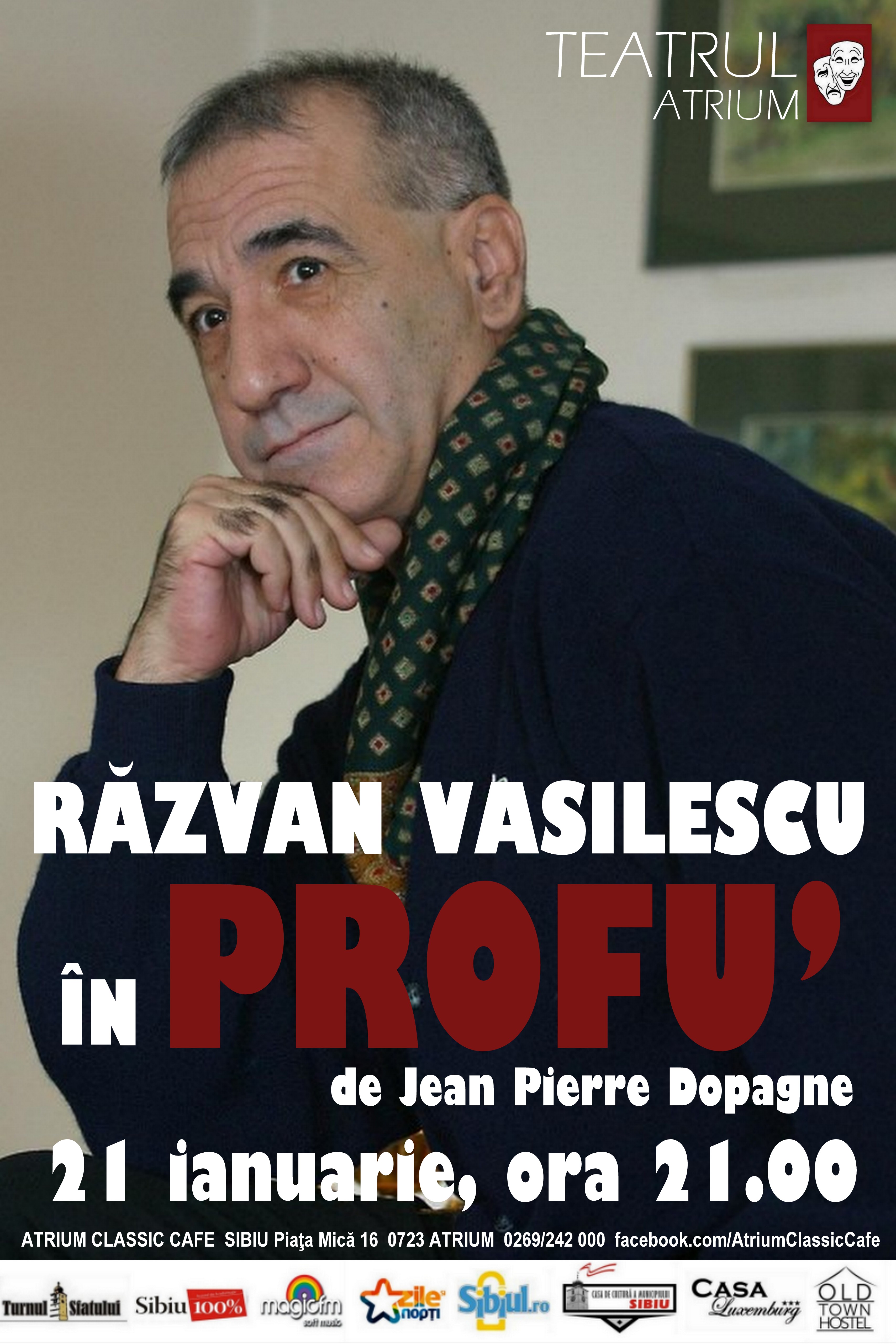 Teatrul ATRIUM continuă stagiunea cu spectacolul PROFU’ de Jean-Pierre Dopagne, cu marele actor Răzvan Vasilescu – un dascăl care înlocuieşte catalogul cu o mitralieră.