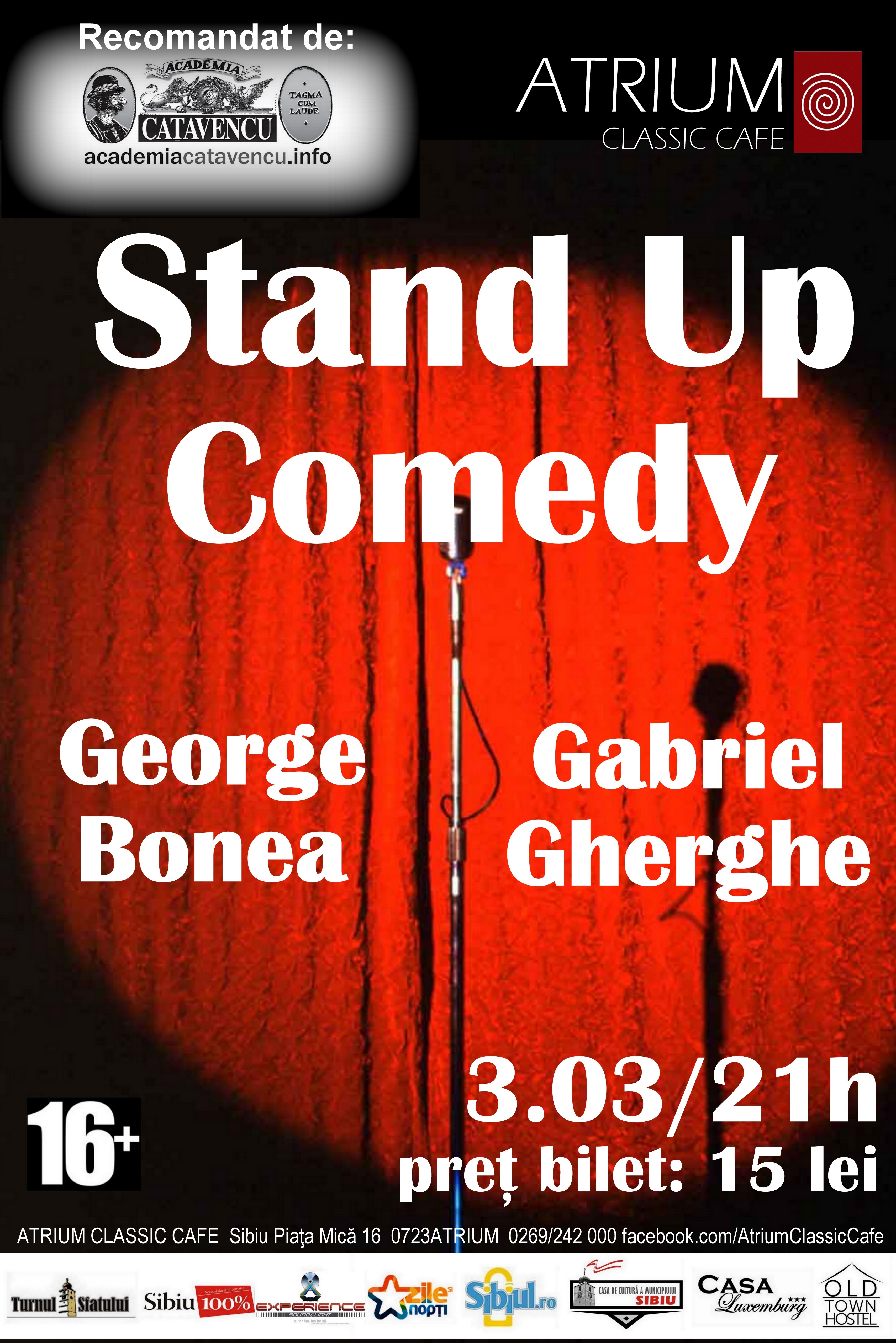 Pe 3 martie, ora 21, te aşteptăm la un spectacol de Stand Up Comedy susţinut de George Bonea şi Gabriel Gherghe, doi dintre tinerii comedianţi aflaţi în ascensiune maximă! Spectacol recomandat de Academia Caţavencu.
