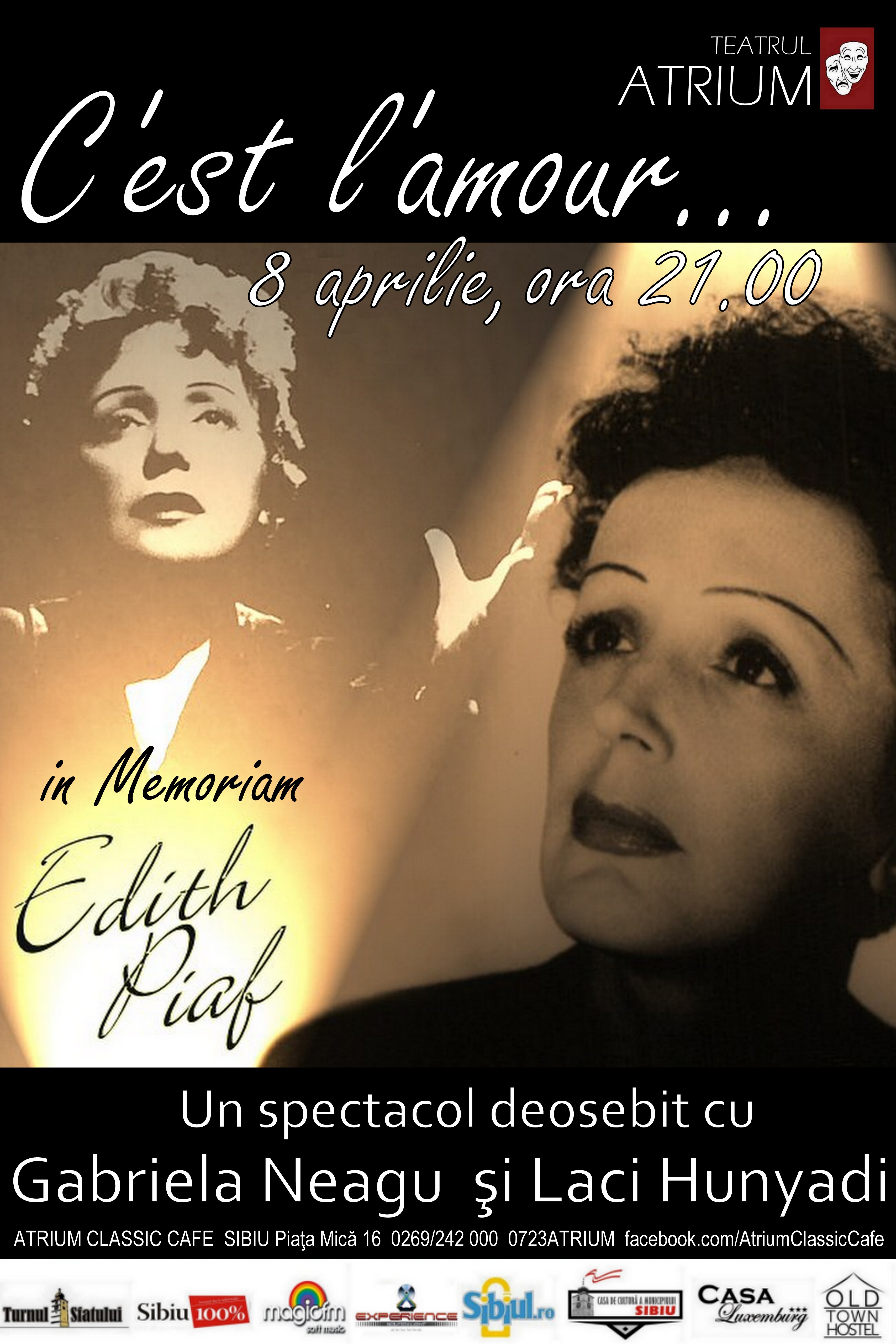 Luni, 8 aprilie, vă invităm la un moment deosebit în cadrul serilor noastre de teatru: C’est l’amour… In memoriam Edith Piaf. Vor fi alături de noi dna Gabriela Neagu şi dl Laci Hunyadi, care au interpretat acest spectacol pe scena Teatrului Naţional Radu Stanca cu un succes răsunător.