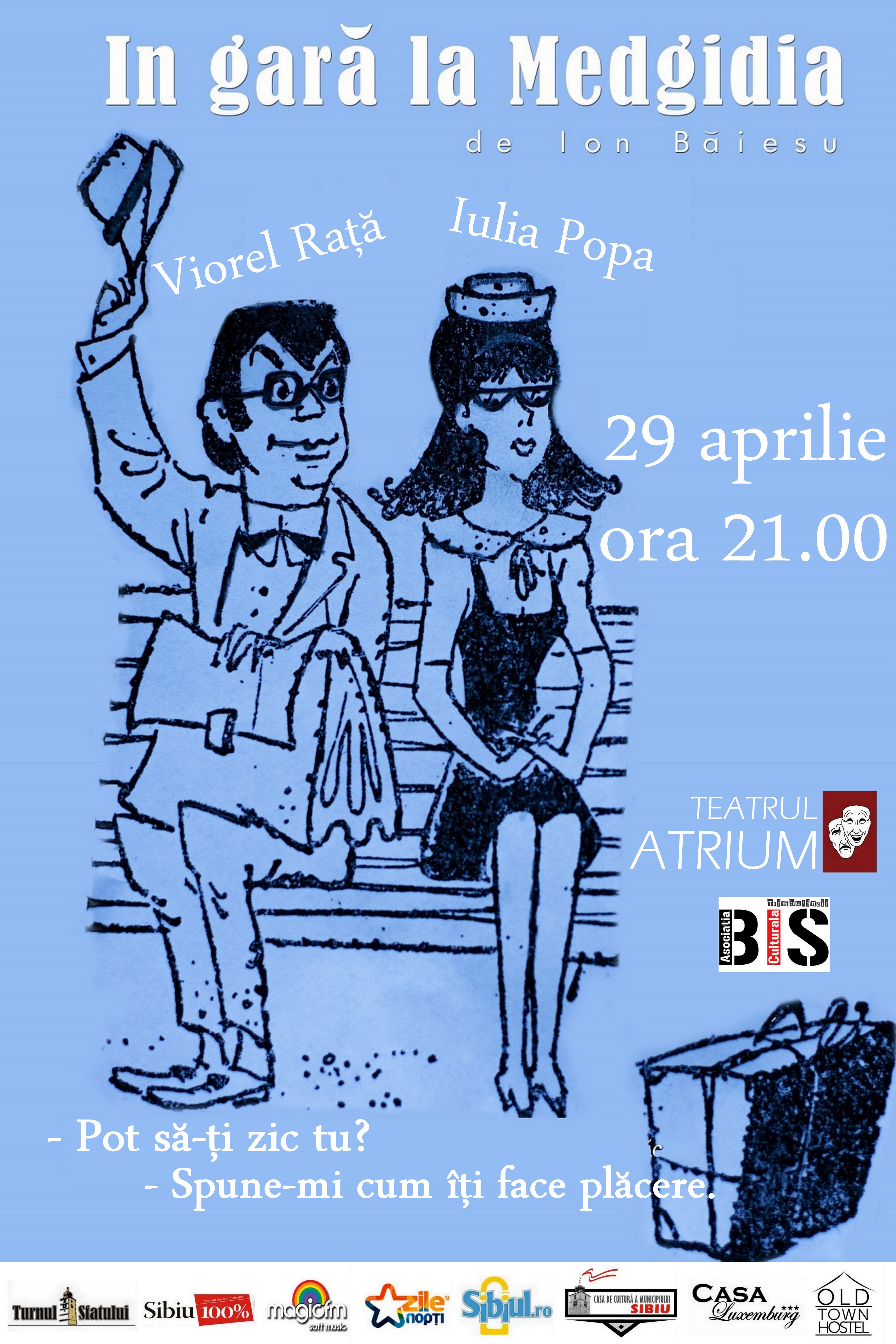 Vă invităm luni, 29 aprilie, pe la ora 9 trecute fix, la o comedie cu Viorel Raţă şi Iulia Popa, după texte de Ion Băieşu: ÎN GARĂ LA MEDGIDIA.