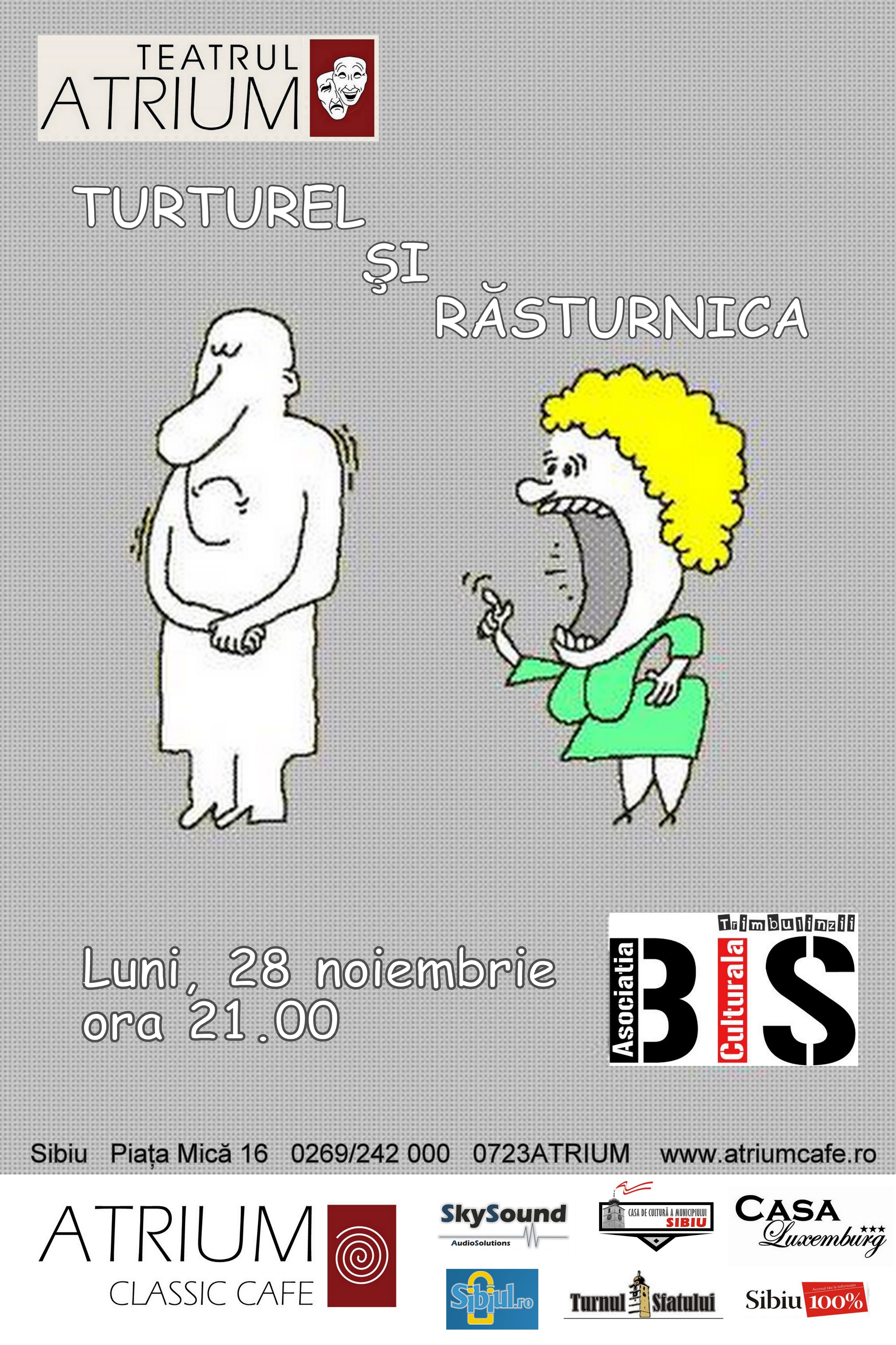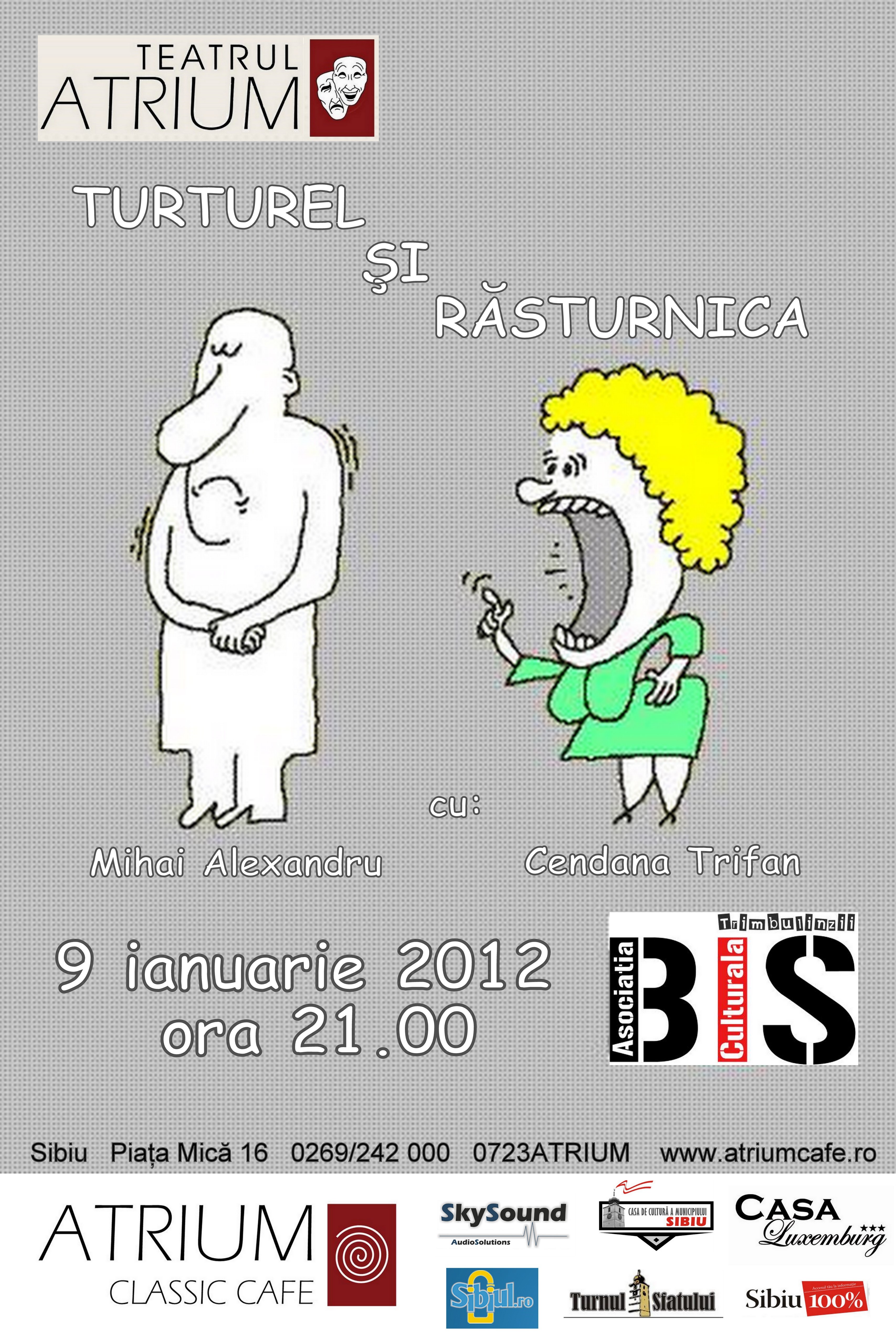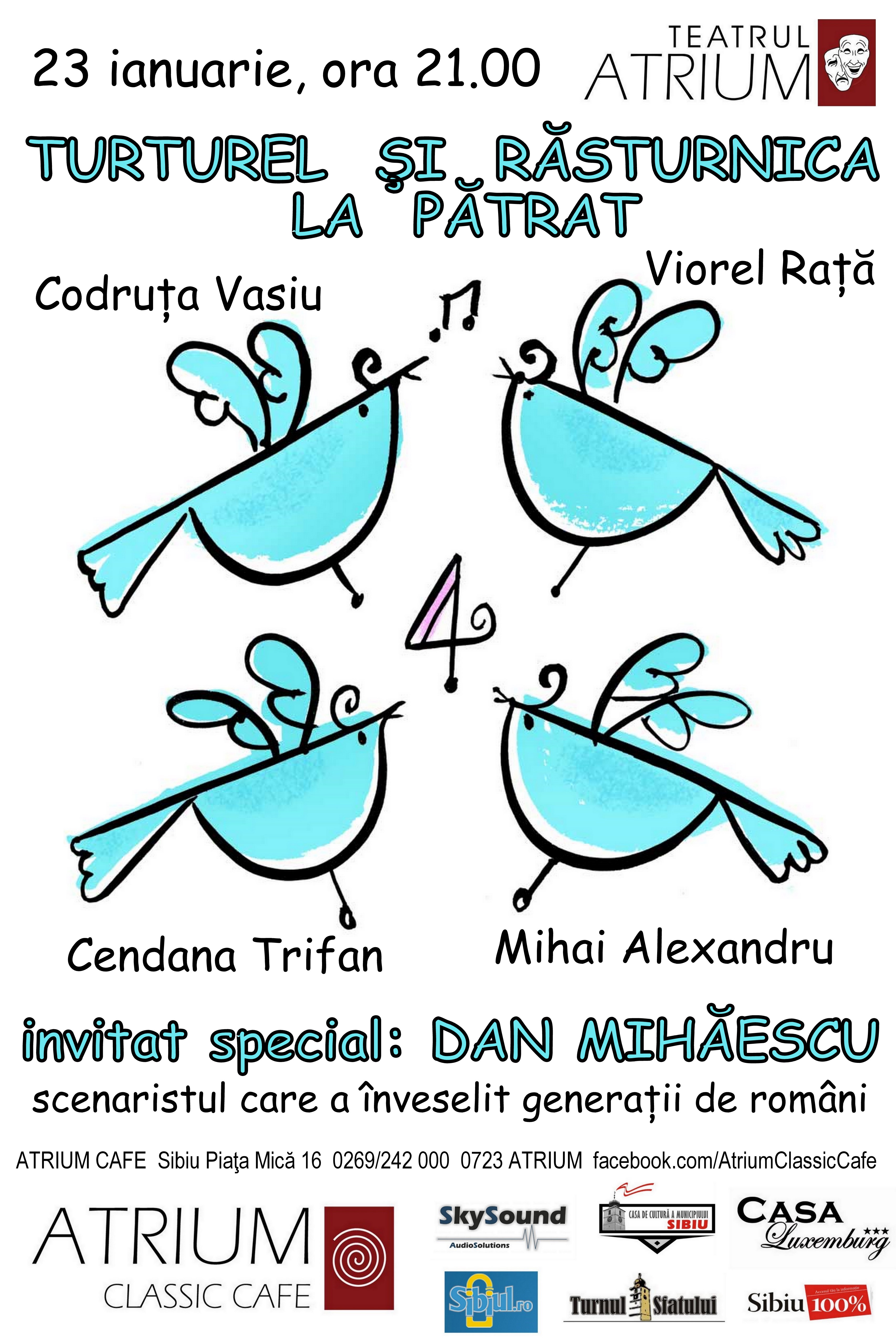 Vă invităm în Atrium Classic Cafe, în premieră absolută, la o comedie de proporţii: „TURTUREL ŞI RĂSTURNICA LA PĂTRAT”. Textele îi aparţin lui Dan Mihăescu; din distribuţie fac parte Viorel Raţă, Codruţa Vasiu, Mihai Alexandru, Cendana Trifan; aranjament artistic de cafenea: Bogdan Sărătean.