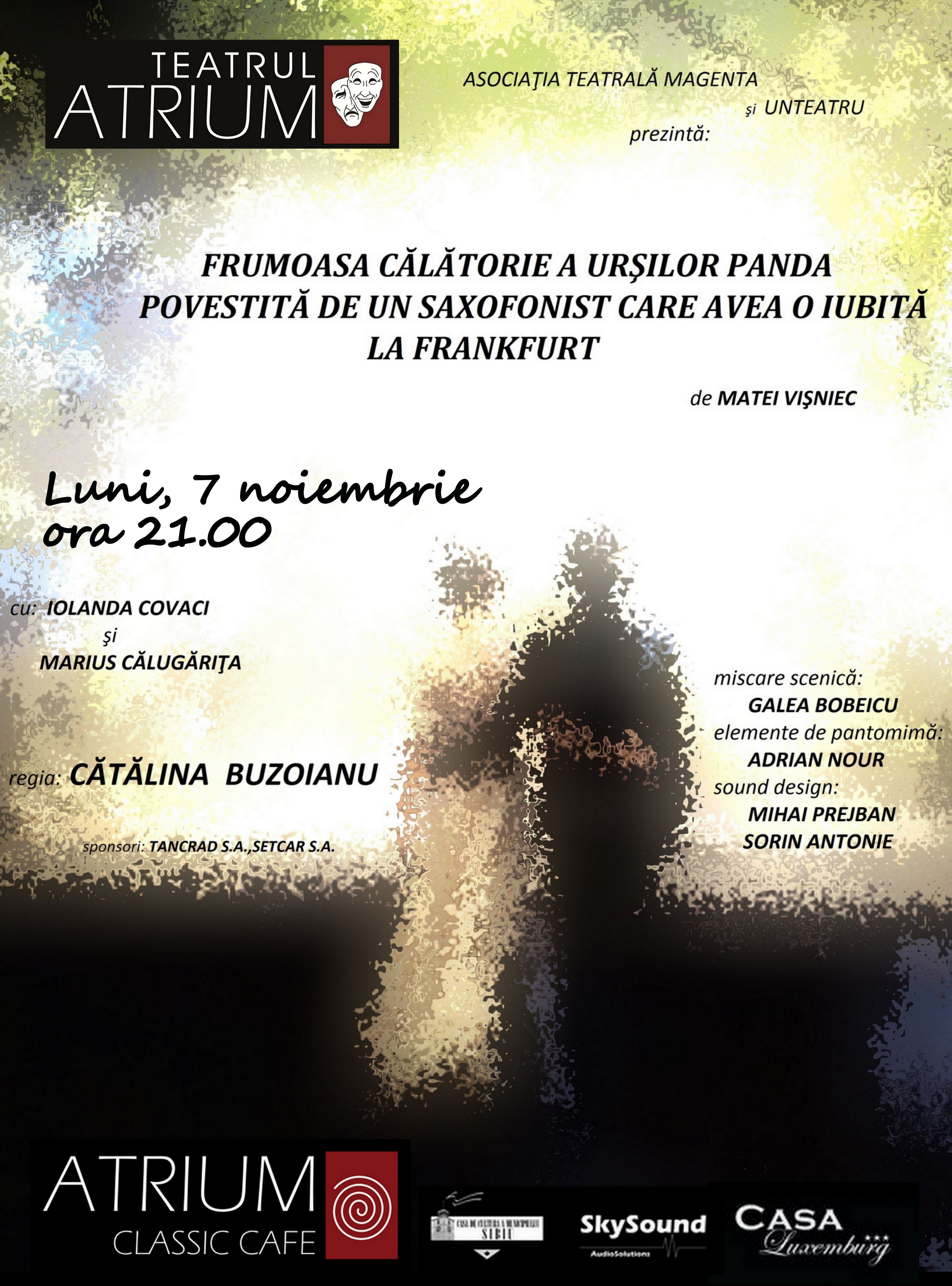 Teatrul ATRIUM vă invită luni, 7 noiembrie, în Atrium Classic Cafe, la o poveste de iubire de două nopţi în spectacolul „Frumoasa călătorie a urşilor panda povestită de un saxofonist care avea o iubită la Frankfurt”de Matei Vişniec, în regia celebrei regizoare Cătălina Buzoianu.