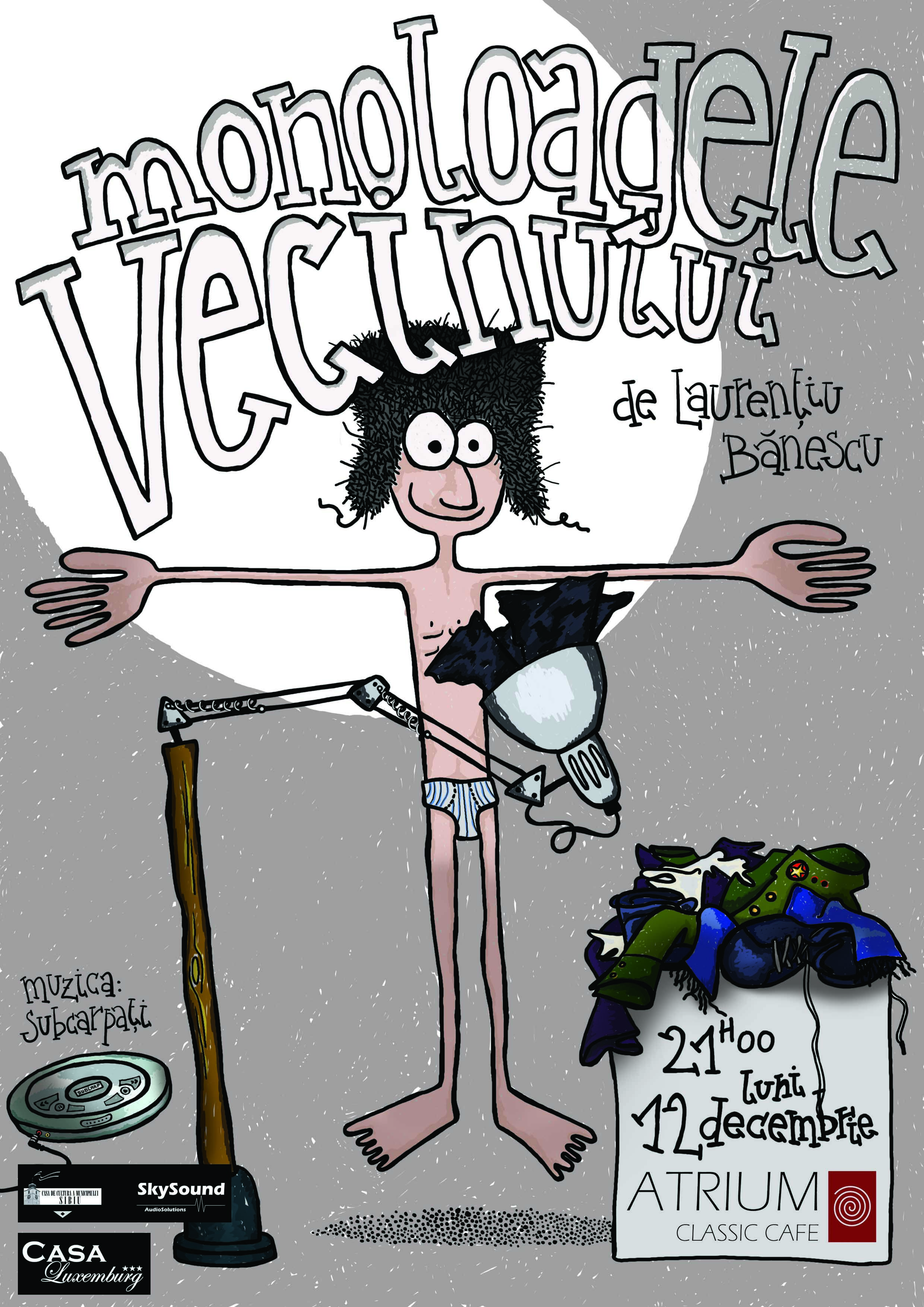Teatrul ATRIUM vă invită luni, 12 decembrie, la un one-man show excepţional de şi cu Laurenţiu Bănescu: „Monoloagele vecinului”, pentru prima dată în Sibiu, în Atrium Classic Cafe.