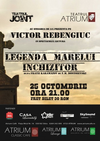 Teatrul ATRIUM în colaborare cu Teatrul JOINT prezintă spectacolul lectură al lui Victor Rebengiuc: Legenda Marelui Inchizitor, după Fraţii Karamazov de F.M. Dostoievski. Acesta va avea loc luni, 25 octombrie, ora 21:00, în Atrium Classic.