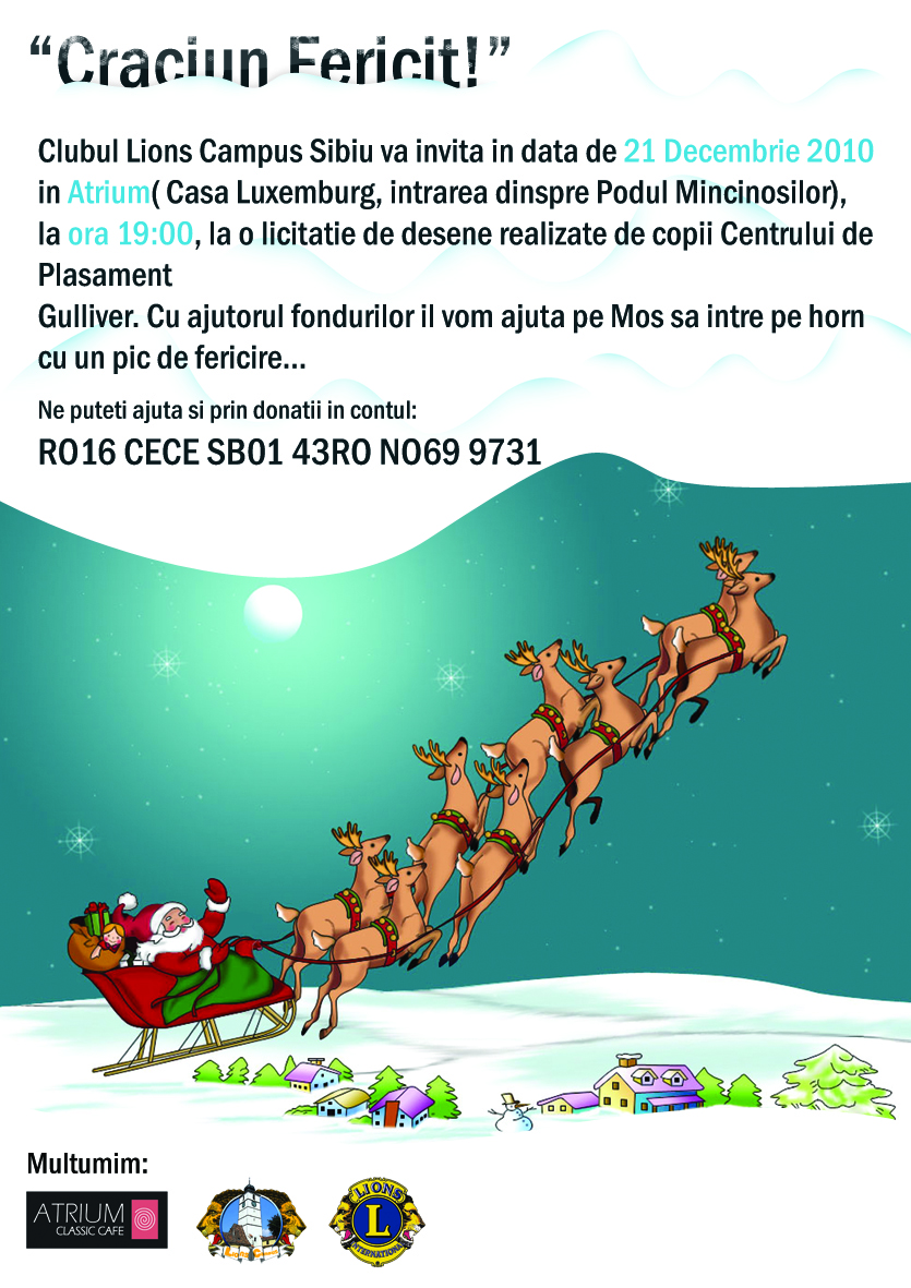 Cu ocazia Sărbătorilor de Iarna, Clubul LIONS CAMPUS Sibiu vă invită la LICITAŢIA organizată cu prilejul CRĂCIUNULUI, eveniment ce va avea loc, marţi 21.12.2010, ora 19, la Atrium Classic Cafe din Piaţa Mică, Sibiu.