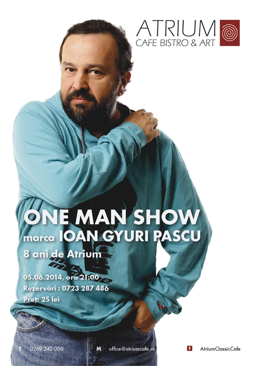 Pentru că împlinim 8 ani de la deschidere, pe 5 iunie 2014, începând cu ora 21, vă aşteptăm să ne bucurăm impreună la un spectacol aniversar “One man show”, marca Ioan Gyuri Pascu, cu întâmplări din viaţa artistului comentate în registru comic şi alternate cu piese muzicale inedite.