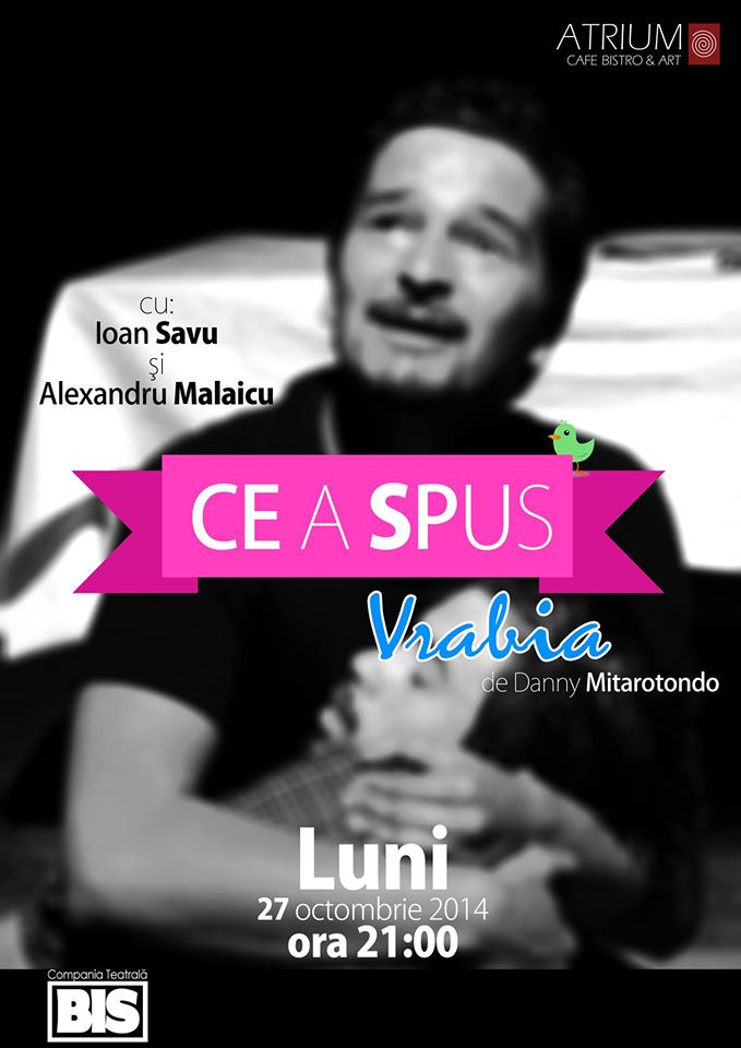 LUNI, 27 OCTOMBRIE, ÎN PREMIERĂ ABSOLUTĂ, “CE A SPUS VRABIA”, un spectacol cu Ioan Savu şi Alexandru Malaicu.