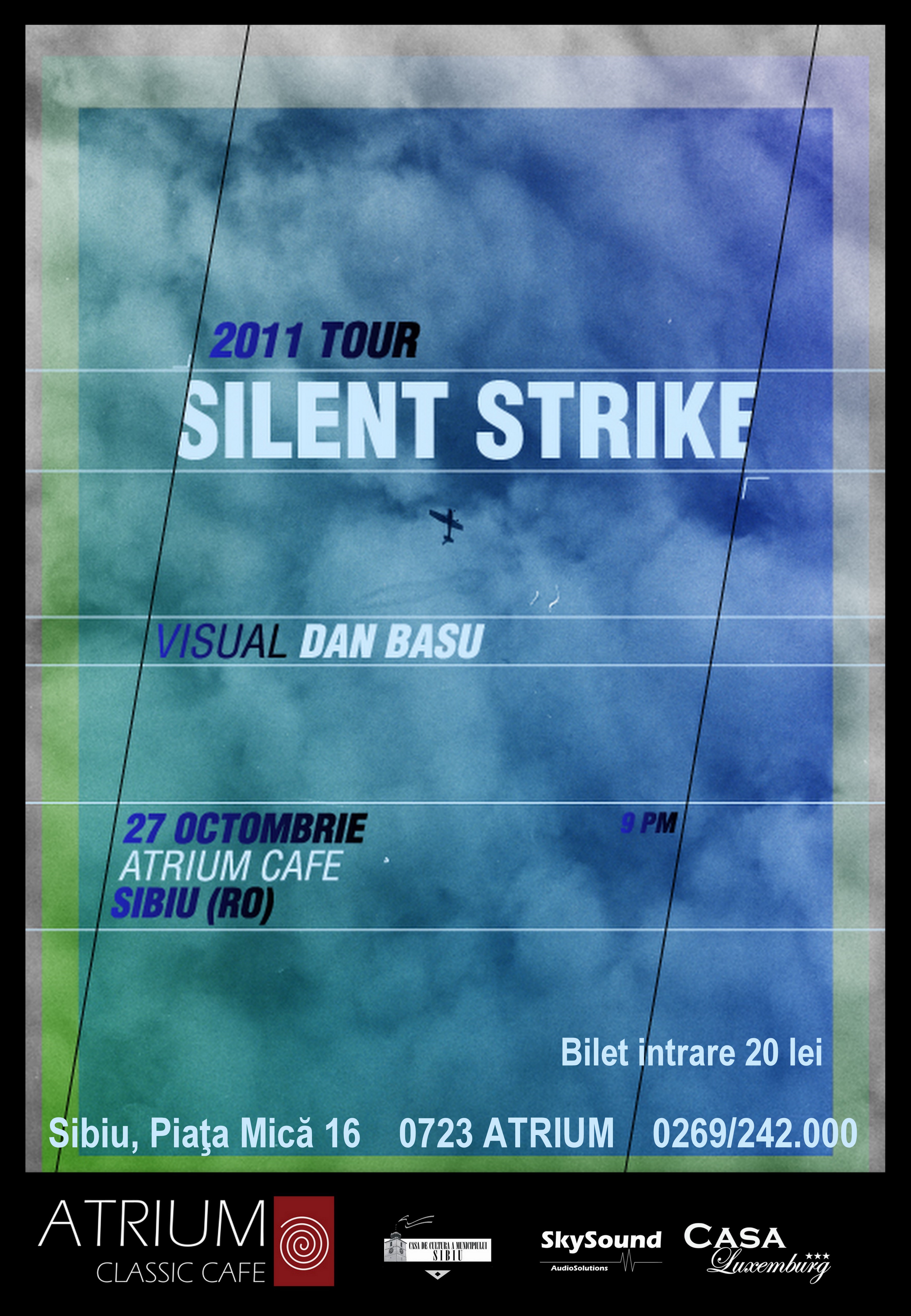 26 octombrie 2011: CONCERT SILENT STRIKE SI VISUAL DAN BASU. În cadrul turneului din toamna 2011, Silent Strike va susţine un concert pe 27 octombrie 2011 la noi în cafenea. La acest eveniment va fi invitat si Dan Basu – visuals. Bilet intrare 20 lei.
