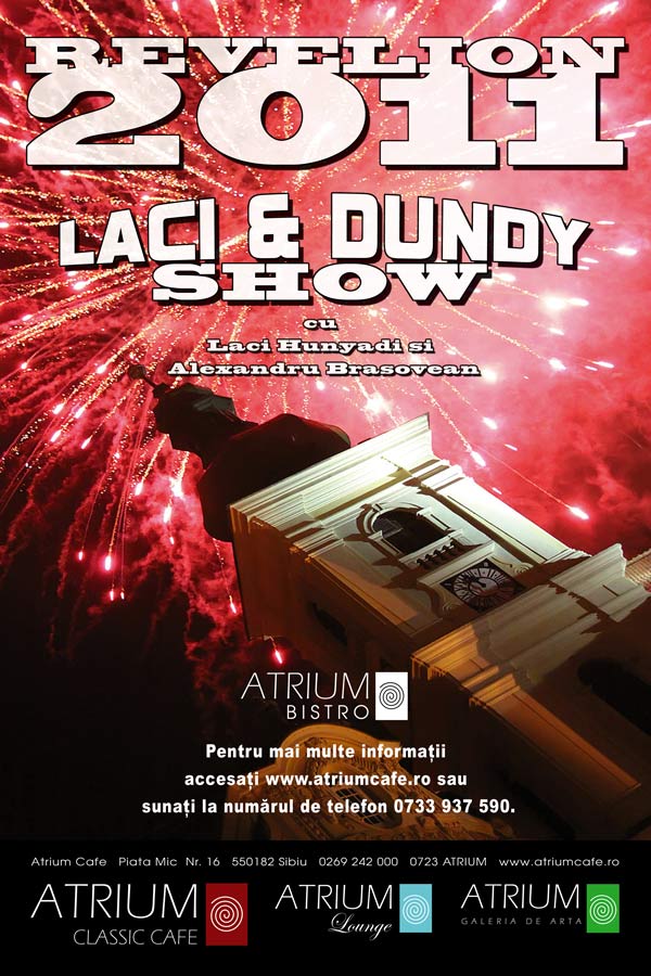 Vă invităm să petreceţi revelionul alături de prieteni în Atrium Classic Cafe. Avem pregătită pentru voi o seară extraordinară. Muzica asigurată de Laci şi Dundy, open bar şi buffet suedez, artificii asigurate de primărie şi, dacă sunteţi curioşi, trupele Non Profit, Riff, Juke Box şi Cargo vor concerta pe scena din centrul oraşului, aproape de noi…