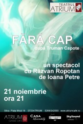 Teatrul Atrium vă invită luni, 21 noiembrie, ora 21.00, în Atrium Classic Cafe (Sibiu, Piaţa Mică 16)  la un one man show  cu Răzvan Ropotan: FĂRĂ CAP, un spectacol după Truman Capote în regia Ioana Petre. Vincent, alb, mascul, 24 de ani. Se trezeste la realitate după ce o fată enigmatică îi aduce un tablou în care se regăsește. Ea dispare. El o găsește. Un love story. Sau un film polițist? Vom vedea luni, 21 noiembrie, ora 21.00 în Atrium Classic Cafe. Biletul de intrare este 10 lei. Rezervări se pot face la numerele de telefon 0723ATRIUM sau 0269/242 000.