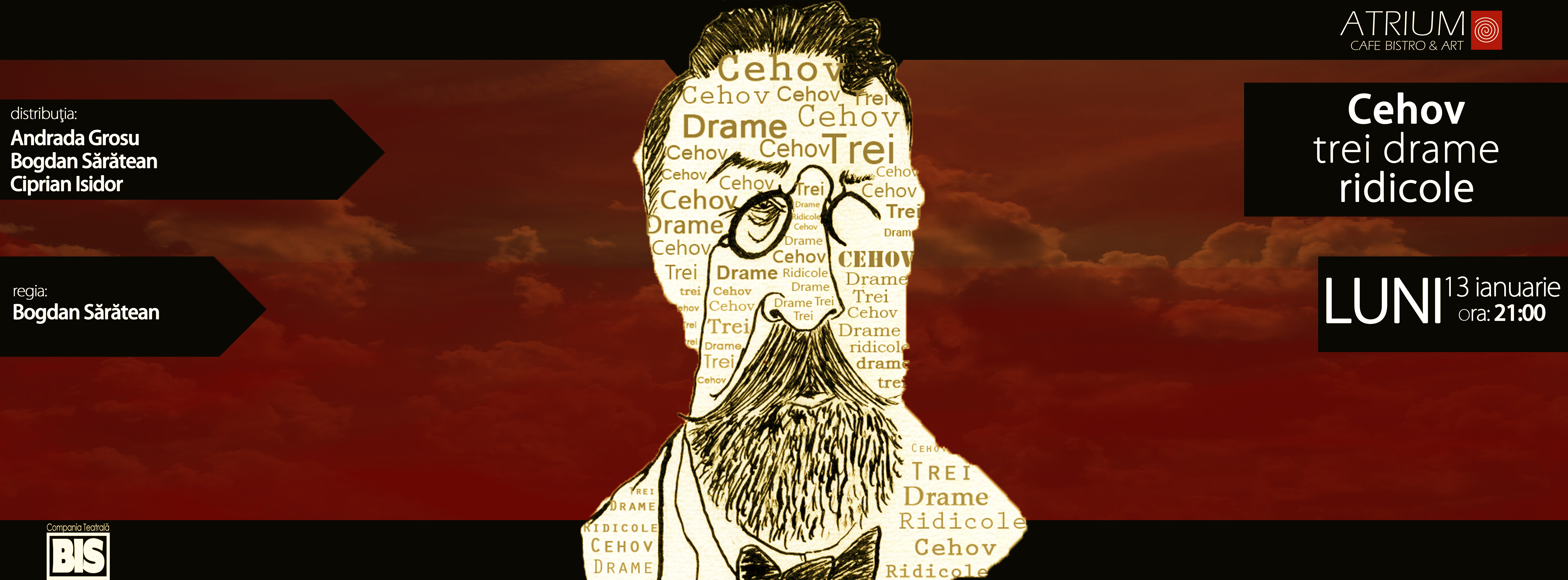 Luni, 13 ianuarie 2014, la ora 21.00, Compania Teatrală BIS prezintă spectacolul „CEHOV – trei drame ridicole”. Vă aşteptăm la o întâlnire cu lumea povestirilor scurte marca Anton Pavlovici Cehov.