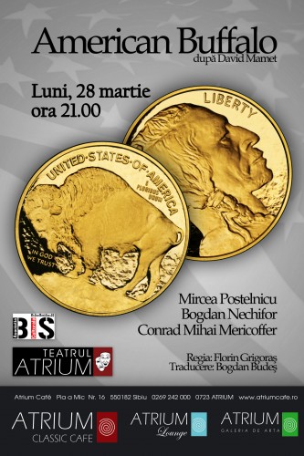Atrium Classic Cafe vă invită la un spectacol extraordinar, „AMERICAN BUFFALO” de David Mamet, traducere Bogdan Budeş, cu Mircea Postelnicu, Conrad Mihai Mericoffer, Bogdan Nechifor. Acest spectacol este în continuarea Festivalului maraton de teatru: RESPIRĂ.TEATRU 25 de ore de teatru non-stop.