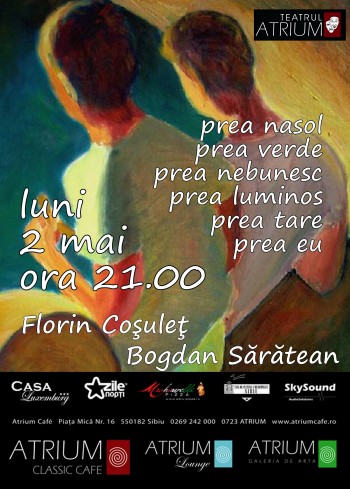 Teatrul ATRIUM prezinta: FLORIN COSULET SI BOGDAN SARATEAN Luni, 2 mai 2011, ora 21.00 Fara nici o alta prezentare, dorim sa va anuntam ca luni, 2 mai, incepand cu ora 21.00, in Atrium Classic Cafe, va avea loc un show extraordinar cu Florin Cosulet si Bogdan Saratean. Ei au spus despre spectacol asa: prea nasol prea verde prea nebunesc prea luminos prea tare prea eu Vom vedea luni, 2 mai, ora 21.00 ce inseamna asta:) Rezervari se pot face la numerele de telefon 0723 ATRIUM sau 0269 242 000. Biletul de intrare este 10 lei.