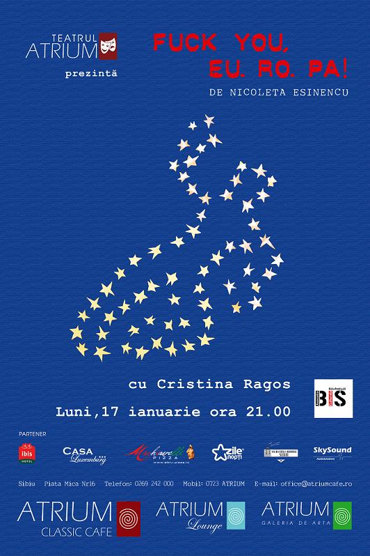 Un one woman show emoţionant şi antrenant cu Cristina Ragos: FUCK YOU, EU. RO. PA! Luni, 17 ianuarie 2011, ora 21.00. Rezervări se pot face la numerele de telefon 0269/242 000 sau 0723 ATRIUM. Biletul de intrare este 7 lei.