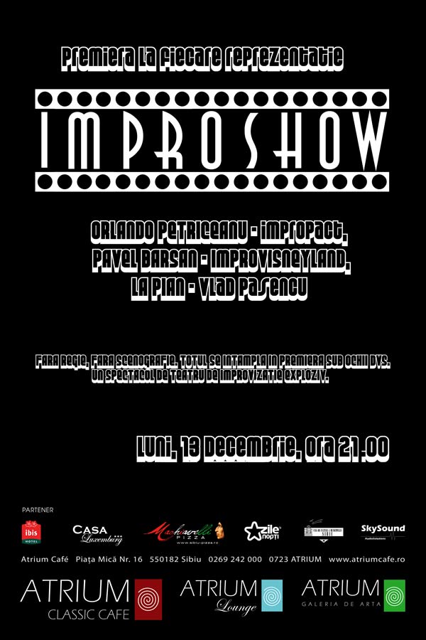 Vă aşteptăm aşadar la IMPROSHOW în Atrium Classic Café, luni, 13 decembrie, ora 21.00. Rezervări se pot face la numerele de telefon 0269/242.000 sau 0723 ATRIUM. Biletul de intrare este 15 lei.