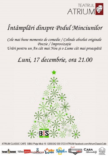 Acum, la sfârşit de an, actorii vă invită la o seară absolut specială. Dorim Cele mai bune momente de comedie, Colinde absolut originale, Poezie, improvizaţie şi urări pentru un An cât mai Nou şi o Lume cât mai proaspătă, toate acestea în spectacolul „Întâmplări dinspre Podul Minciunilor”