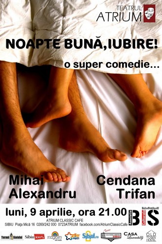 „NOAPTE BUNĂ, IUBIRE!”, cu un cuplu minunat de actori tineri, Mihai Alexandru şi Cendana Trifan. Mihai Alexandru poate fi văzut pe scena Teatrului Naţional „Radu Stanca”, în „Balul”. Cendana Trifan a debutat pe scena aceluiaşi teatru în spectacolul „Casa Andersen”. La ATRIUM i-aţi putut vedea în „Ale vieţii valuri”, „Eu sunt două femei”.