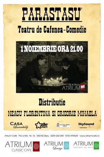 Atrium Classic Cafe vă invită luni, 1 noiembrie, începând cu ora 9 seara, la premiera piesei de teatru „Parastasu”, un spectacol cu şi despre ritualurile româneşti, în speţă cele olteneşti.