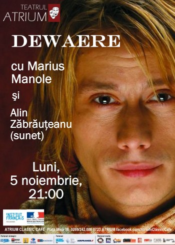 Atrium Classic Cafe vă invită la o seară fascinantă în încheierea Festivalului de Film Francez de la Sibiu, luni, 5 noiembrie 2012, ora 21:00, cu un moment special dedicat actorului francez Patrick Dewaere la împlinirea a 30 de ani de la moartea acestuia. Vă invităm ca împreună cu actorul Marius Manole (Teatrul Naţional Bucureşti) şi sound-designerul Alin Zăbrăuţeanu (Jazzadezz) să încercăm să punem în lumină câteva dintre ungherele sufleteşti ale artistului şi omului Patrick Dewaere. Concept, texte şi intervenţii audio-video: Radu Rădescu.