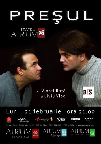 Teatrul ATRIUM vă invită luni, 21 februarie, ora 21.00, la o premieră absolută, spectacolul PREŞUL, cu doi actori ai Teatrului Naţional “Radu Stanca” Sibiu: Viorel Raţă şi Liviu Vlad.