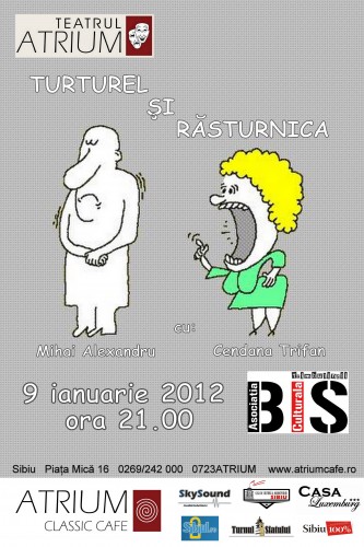 La cererea publicului, spectacolul va deschide anul teatral ATRIUM 2012. În distribuţie, alături de cei doi tineri actori, publicul va regăsi alte două nume de rezonanţă ale teatrului Naţional „Radu Stanca”, în apariţii episodice. Numele cu pricina nu vor fi divulgate înaintea spectacolului. DISTRACŢIE PLACUTĂ ! Să râdem cu poftă şi spor! „Turturel şi Răsturnica”, luni, 9 ianuarie 2012.