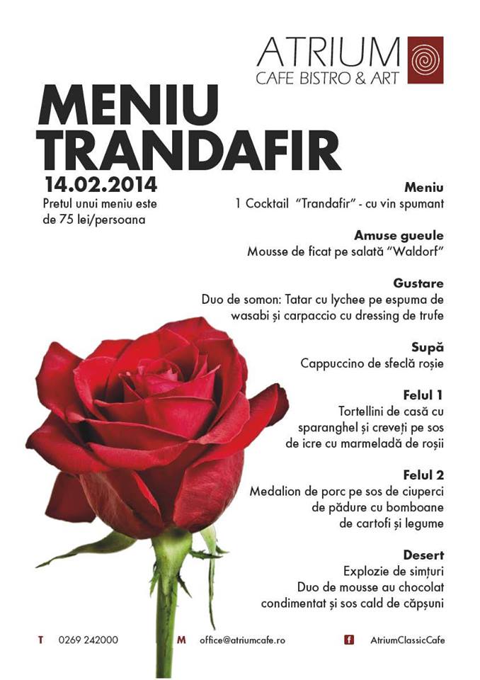 Atrium Cafe Bistro & Art vă invită să sărbătoriți dragostea alături de partenerul/partenera dvs într-o ambianță romantică savurând meniul ales special de Ziua Îndrăgostiților!!